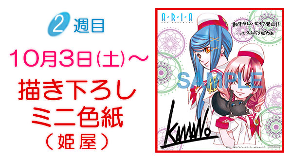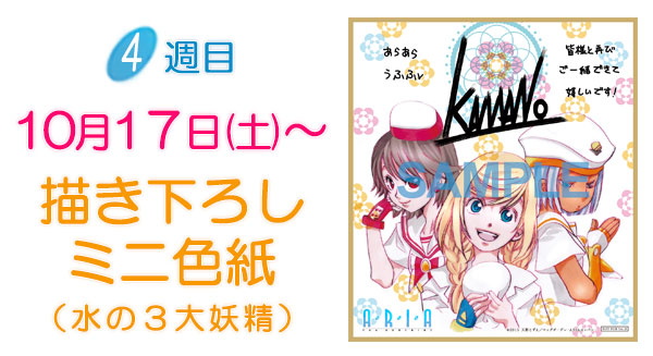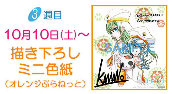 原作者・天野こずえ先生による描き下ろしイラストを使用したミニ色紙。ミニ色紙の絵柄は1週目(ARIAカンパニー)、2週目(姫屋)、3週目(オレンジぷらねっと)の3種類で上映劇場にて配布致します。数量限定のため無くなり次第終了となります。